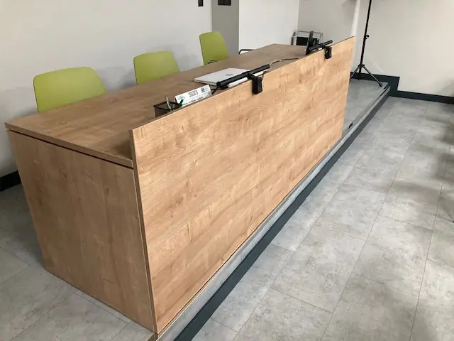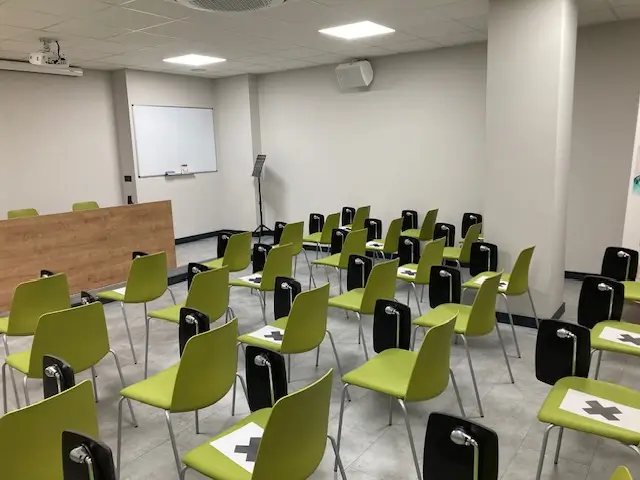 Creamos un espacio versátil para formación y reuniones. Instalamos mobiliario ergonómico que optimiza la comodidad, visibilidad y uso técnico.